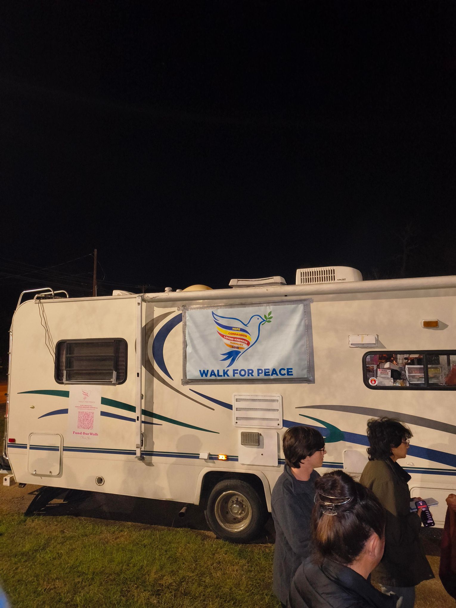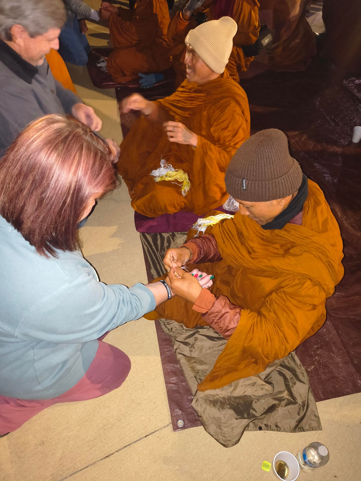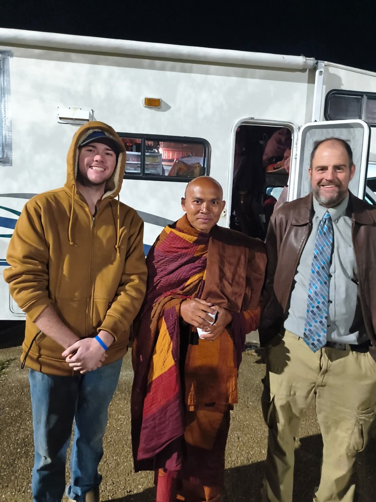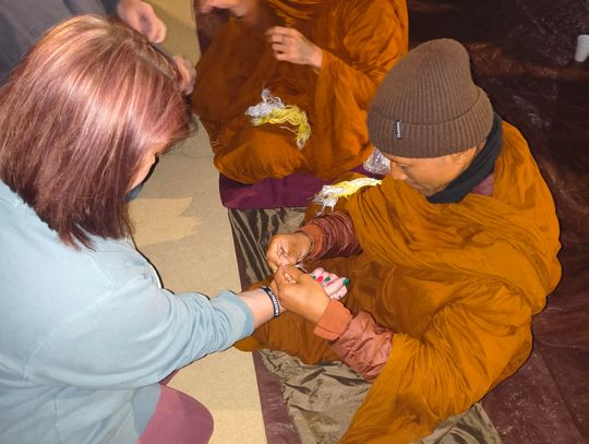 From 5 to 9 p.m. Thursday, residents were invited to Muscadine Park to visit with the monks. The evening included Buddhist chants, guided meditation, question-and-answer sessions, and warm beverages shared among attendees. The monks also welcomed photo opportunities, offered peace bracelets to visitors, and spent time speaking one-on-one with community members.