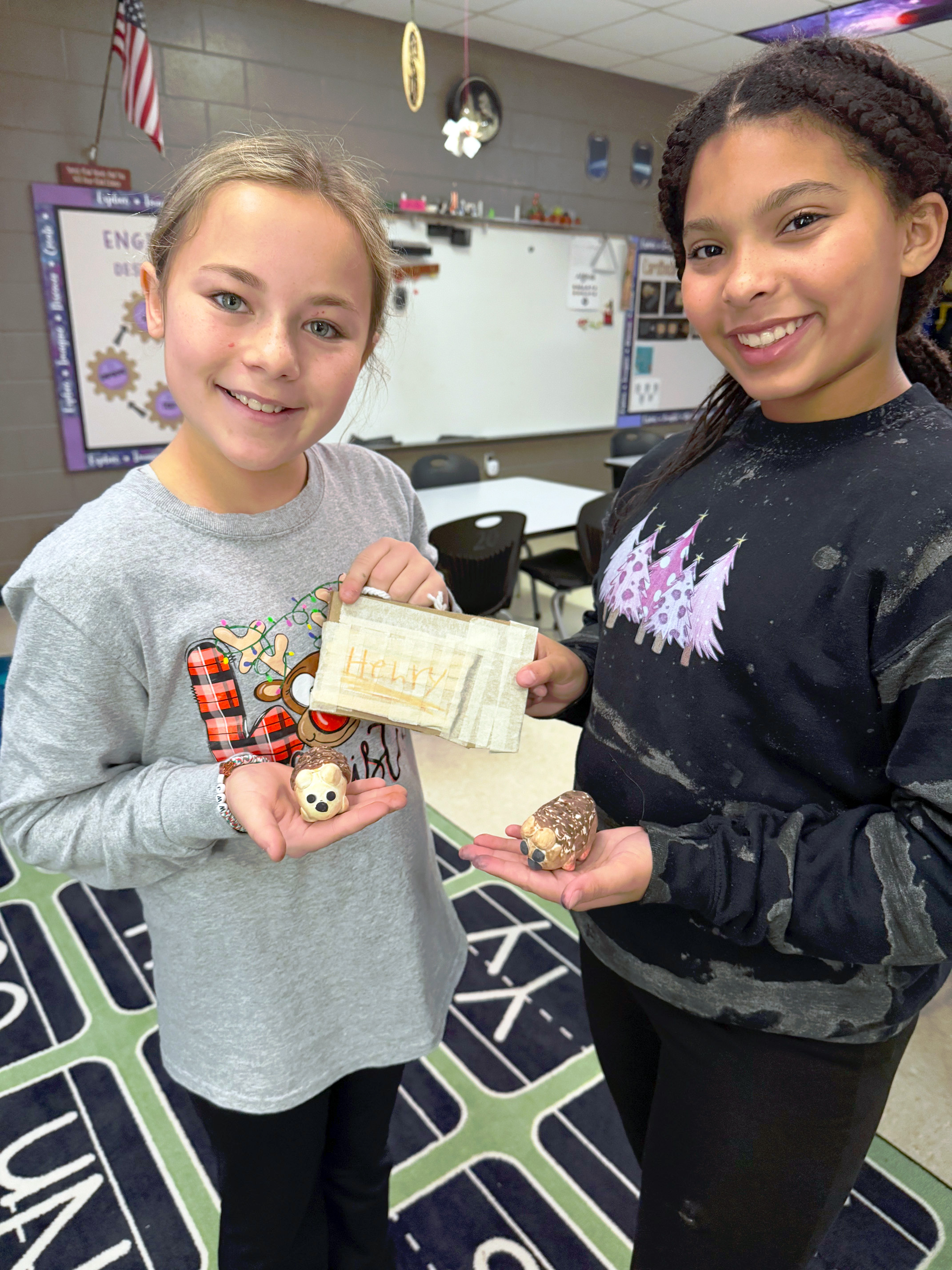 Each class that entered STEAM was concerned about Henry and wanted to help. Many students searched high and low for Henry, but he was not found. The news made two 6th grade students, Hayzlee Nelson and Hadley Taylor, ponder what they could do to help Kinleigh, and they decided that they would create new hedgehogs that Kinleigh could keep. They wanted to make sure the new hedgehogs would look similar to the missing hedgehog, so they took great care when designing them.