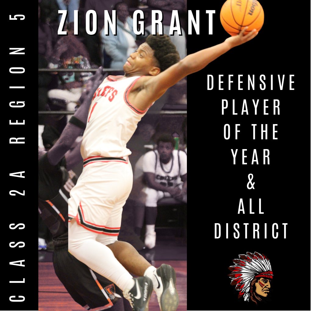 Congratulations to Zion Grant. Zion received 2A Region 5 District Defensive Player of the Year and All District. Zion shows great sportsmanship and leadership on and off the court.